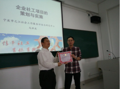 社会工作系邀请了宁波市之江社会工作服务评估与研究中心主任马洪波来到《企业社会工作》课堂,围绕企业社工项目的策划与实施为社工系学生开展了一次别开生面的讲座。在讲课前,社工系主任陈建胜副教授为马洪波颁发了足球推荐