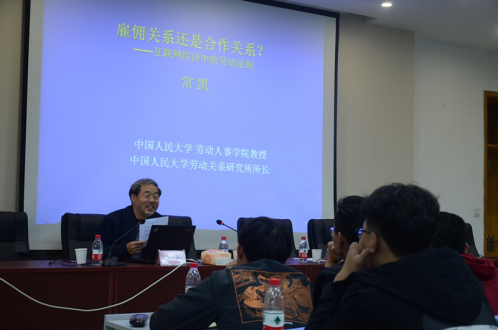 20171019日下午,中国人力资源开发研究会副会长和劳动关系分会会长、中国社会法学研究会副会长、中国劳动学会劳动关系专业委员会副会长中国人民大学劳动关系研究所所长、博士生导师常凯教授,应邀来我作了一场题为“雇佣关系还是合作关系?——互联网经济中的劳动法制”的精彩学术讲座。