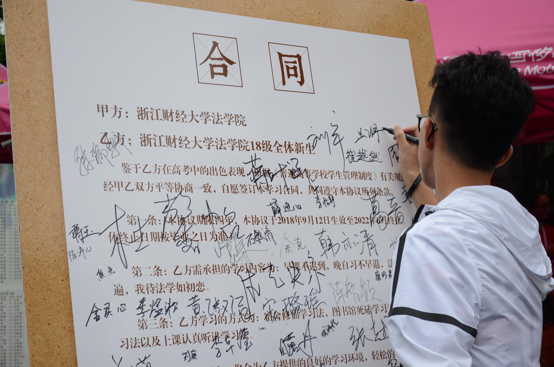 报到现场,新生们在学生会提前准备的“新生合同书”展板上郑重签下自己的姓名,向足球推荐