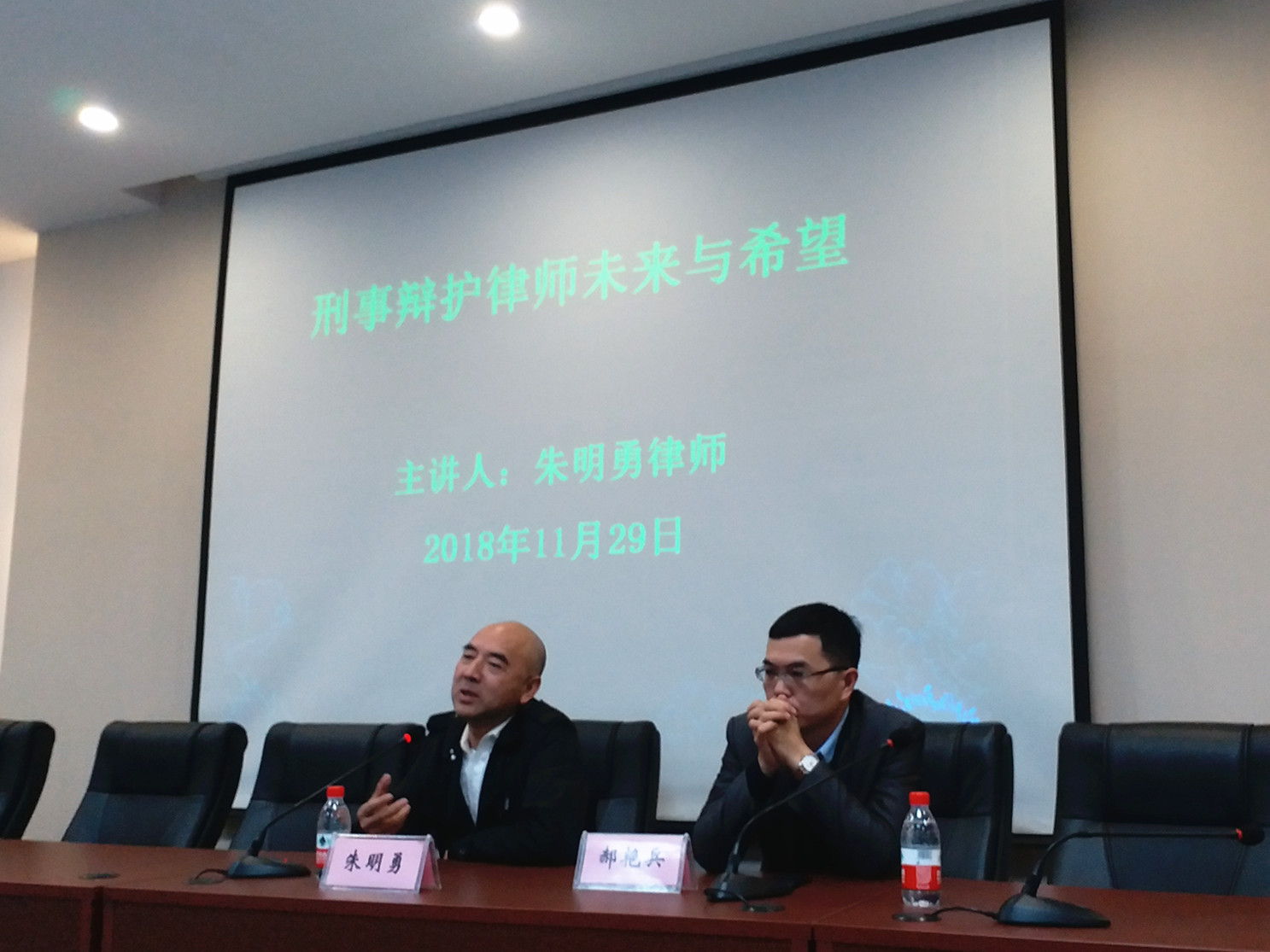 101室举行。我们很荣幸邀请到北京京门律师事务所主任朱明勇律师主讲。本次讲座的主题是“刑事辩护律师未来与希望”。讲座由郝艳兵副教授主持,王俊老师、李森老师、冯姣老师以及足球推荐