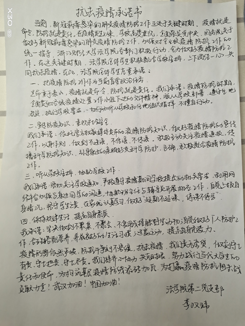 号召,每日健康信息填报,带头做到停课不停学,认真上课做好自我防护,也不忘发挥党员的先锋模范作用并作出郑重承诺。