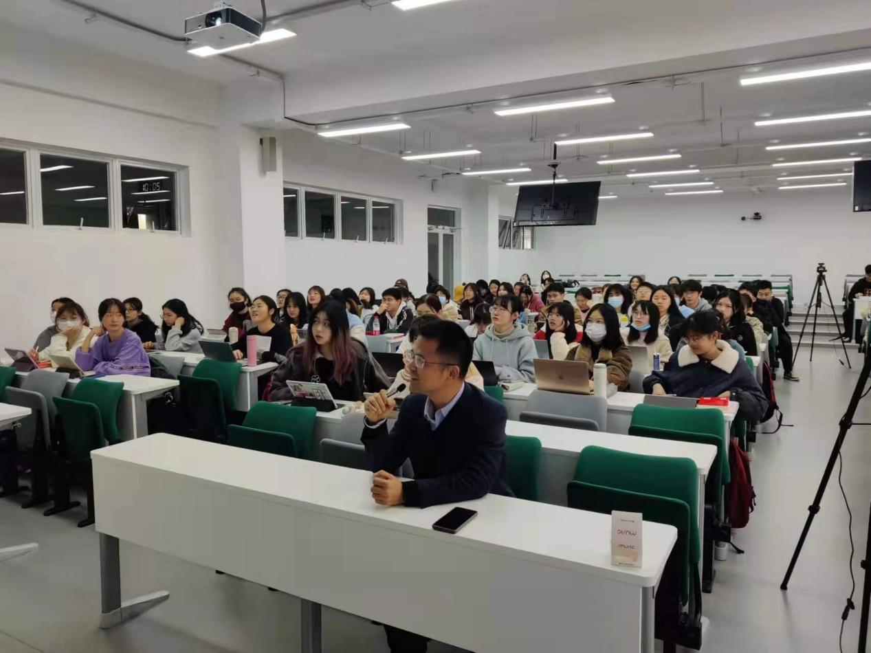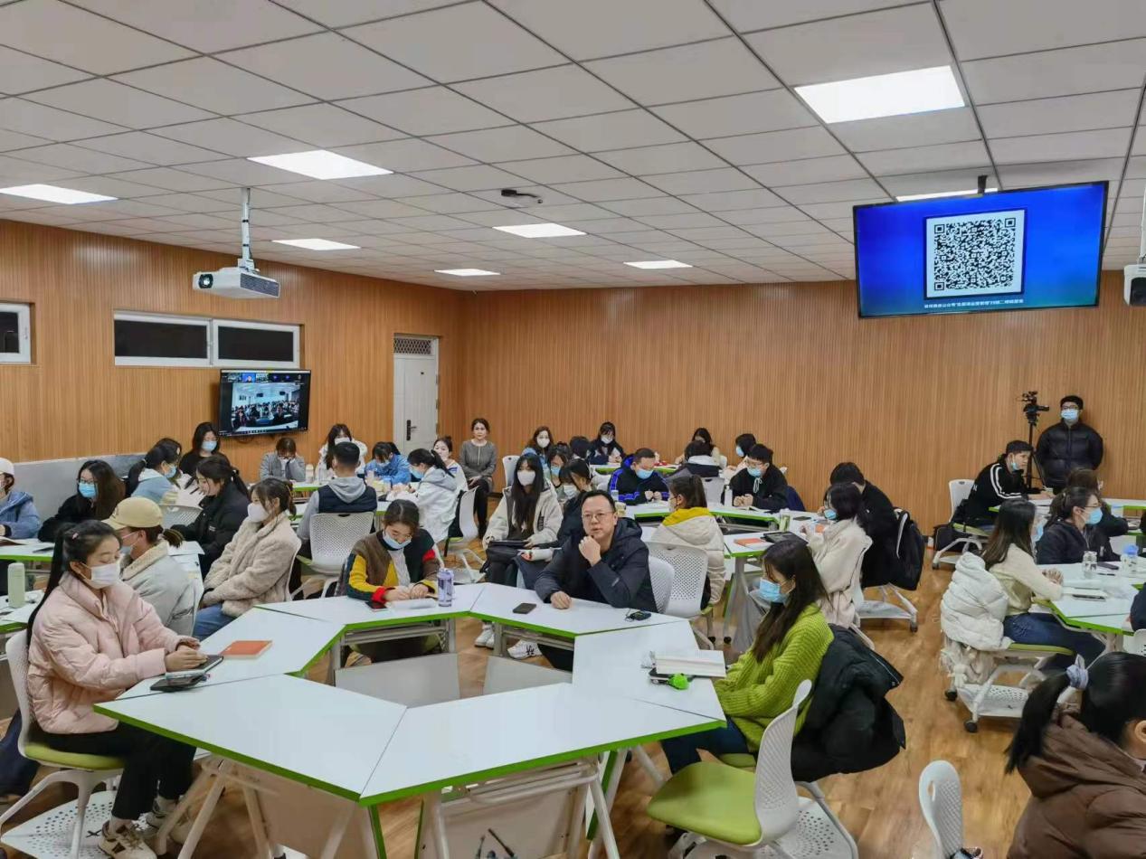 线下教室里的学生穿着衬衫与夹克,而新疆财经大学的学生则披着厚外套。虽然物理的距离给学生们带来了时间和温度上的差异,但他们共享着相同的教育资源,一起听着同一位老师的课。
