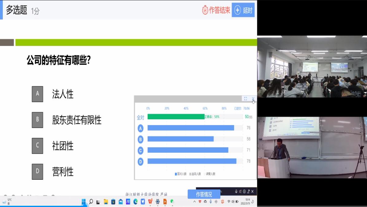 为帮助学生们更好记忆关于公司的相关知识点,严城老师利用雨课堂的“推送习题”功能,每讲解完一个重要知识点,就让学生们实时答题,现场验收课堂成果,根据学生的正确率调整接下来的讲解方向。手机推送习题、线上随机点名、弹幕互动……这些都是同步课堂独特的互动方式。严城老师表示:“和传统的课堂相比,我更喜欢这种融合式课堂,它能够在不打断完整的教学思路和教学设计的前提下,和西部地区的同学展开实时互动。”