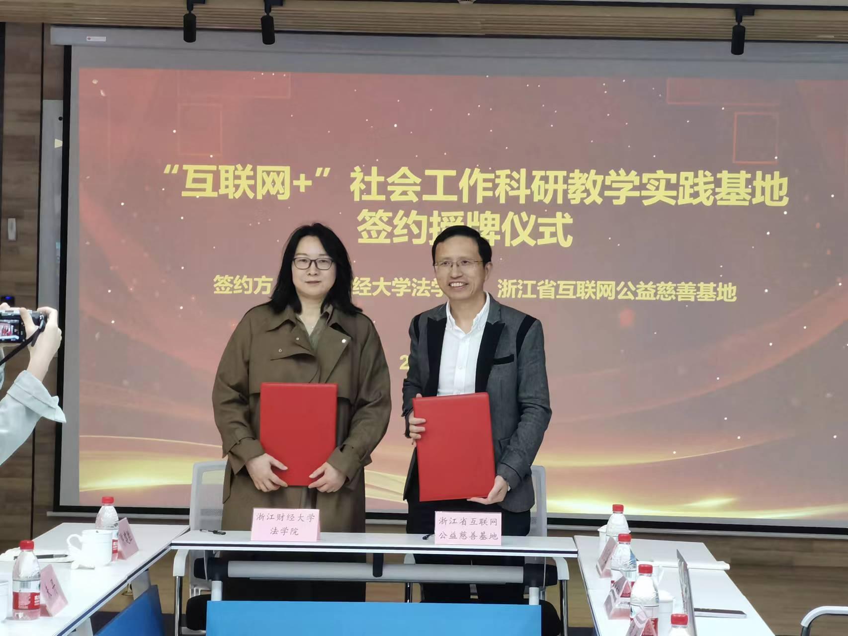 紧接着是实践基地签约仪式。基地主任裘涵与朱丹老师分别代表浙江省互联网公益慈善基地和足球推荐