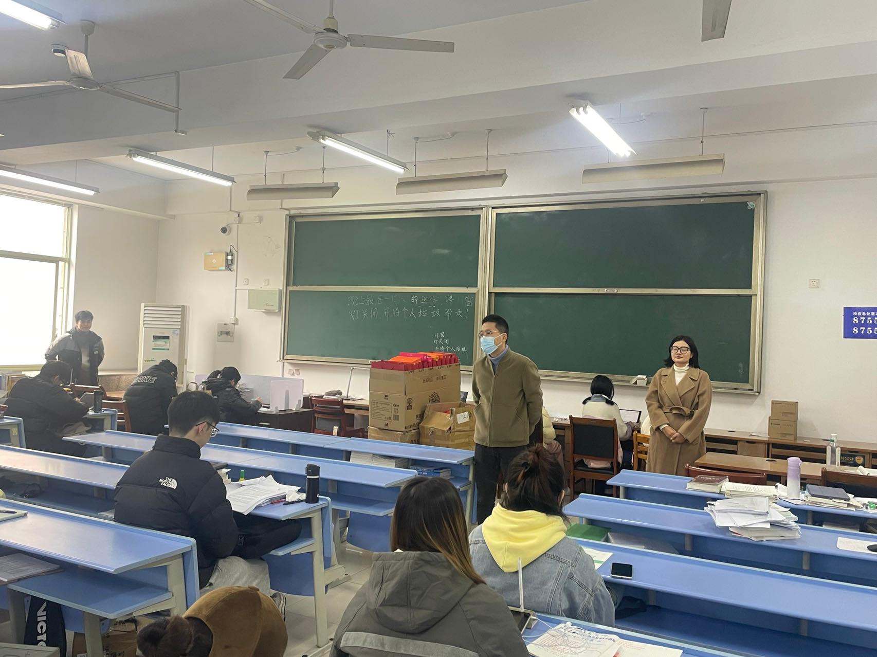 副院长唐勇、党委副书记王文婷、毕业班辅导员董振斌、那桢妮、徐稼钰来到B411考研自习室看望慰问备战考研的学子,鼓励同学们坚持到底,并送上了加油礼包。