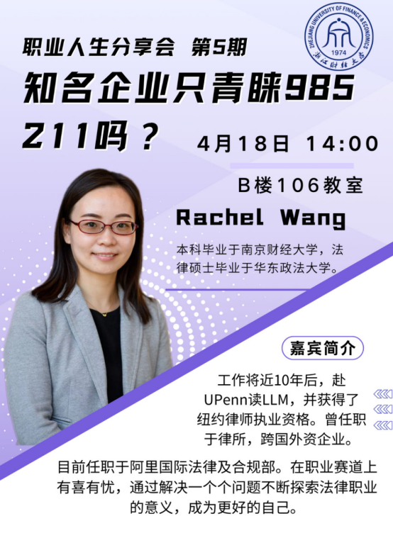 2024年4月18日,2023级非诉实验班班主任张晓晨老师邀请到了宾夕法尼亚大学法学硕士、纽约州执业律师、阿里巴巴国际及法律合规部Rachel Wang女士,为足球推荐