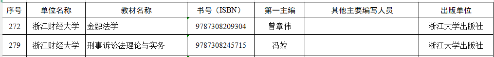 冯姣教授主编的《刑事诉讼法理论与实务》、曾章伟副教授主编的《金融法学》共2本教材入选。