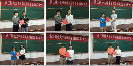 的金超校友(00民商法班)当选会长,浙商银行绍兴分行张琼文(99法学一班)、浙江新昌农村商业银行股份有限公司吴初成(00经济法班)、上虞农村合作银行徐浩锋(01经济法班)、绍兴市柯桥区委办公室沈海风(01民商法班)、诸暨市国土资源局陈杰荣(01民商法班)、绍兴烟草公司嵊州分公司吕旭辉(06经济法班)、绍兴中级人民法院高晶晶(06民商法班)为副会长,选举泰隆银行绍兴分行魏高明(07法务会计)为秘书长、泰隆银行绍兴分行陈林(09法学三班)为副秘书长。罗金艳、李春燕、王俊等老师向新当选校友颁发聘书。