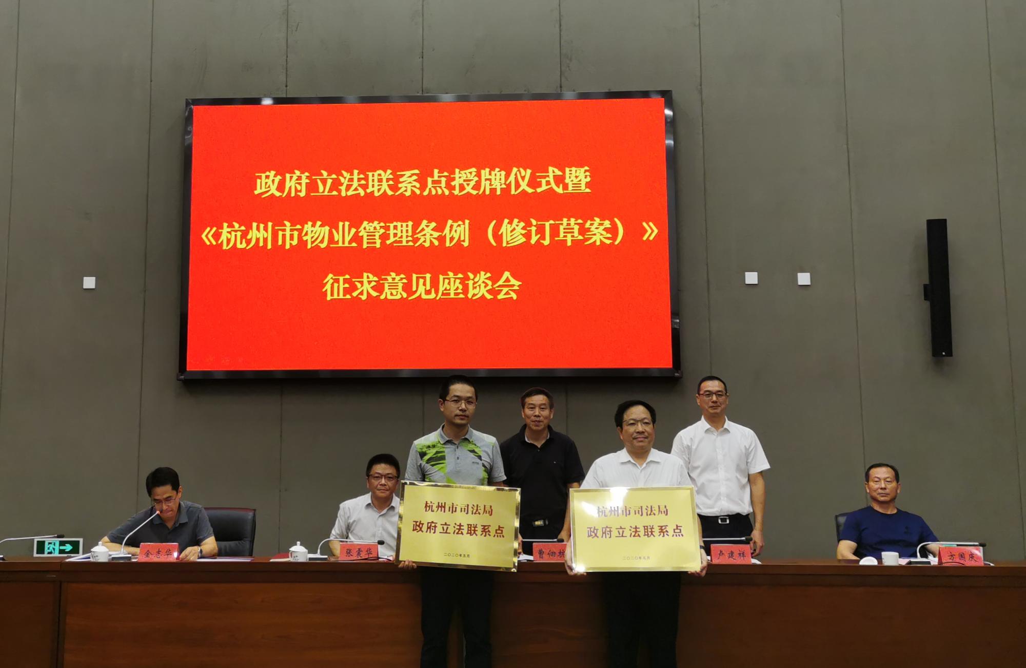 8月25日,杭州市司法局政府立法联系点授牌仪式暨《杭州市物业管理条例(修订草案)》征求意见座谈会在杭州市市民中心会议厅召开。杭州市司法局、市场监管局、住房保障和房产管理局、工商联等单位的领导出席会议。会上宣读了《关于确定政府立法联系点的通知》(杭司[2019]176号),为深入贯彻习近平新时代中国特色社会主义思想和党的十九大精神,落实党中央关于“建立基层立法联系点制度,推进立法精细化”的要求,根据《杭州市司法局政府立法联系点工作规定》,经组织申报、推荐和研究,确定14家单位为政府立法联系点。其中,足球推荐