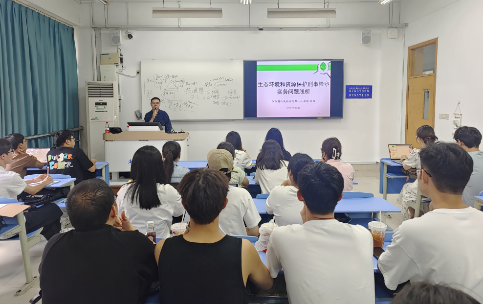 《检察理论与实务》第一讲由浙江省人民检察院陈阳检察官主讲,主题是生态环境和资源保护刑事检察实务问题。陈检察官以河南“掏鸟案”为切入点,详略得当地介绍了破坏环境资源保护犯罪的9个条文、16个罪名。课程结合2018年以来浙江省检察机关的受案情况,对比2016年和2023年的法律解释,介绍了环境犯罪的罪名演进和案件特点,直观反映了刑法对破坏环境犯罪从严打击的立法指导。本次课堂不仅让学生们意识到生态环境保护的重要性,也让学生们进一步加深了对破坏环境犯罪的了解。