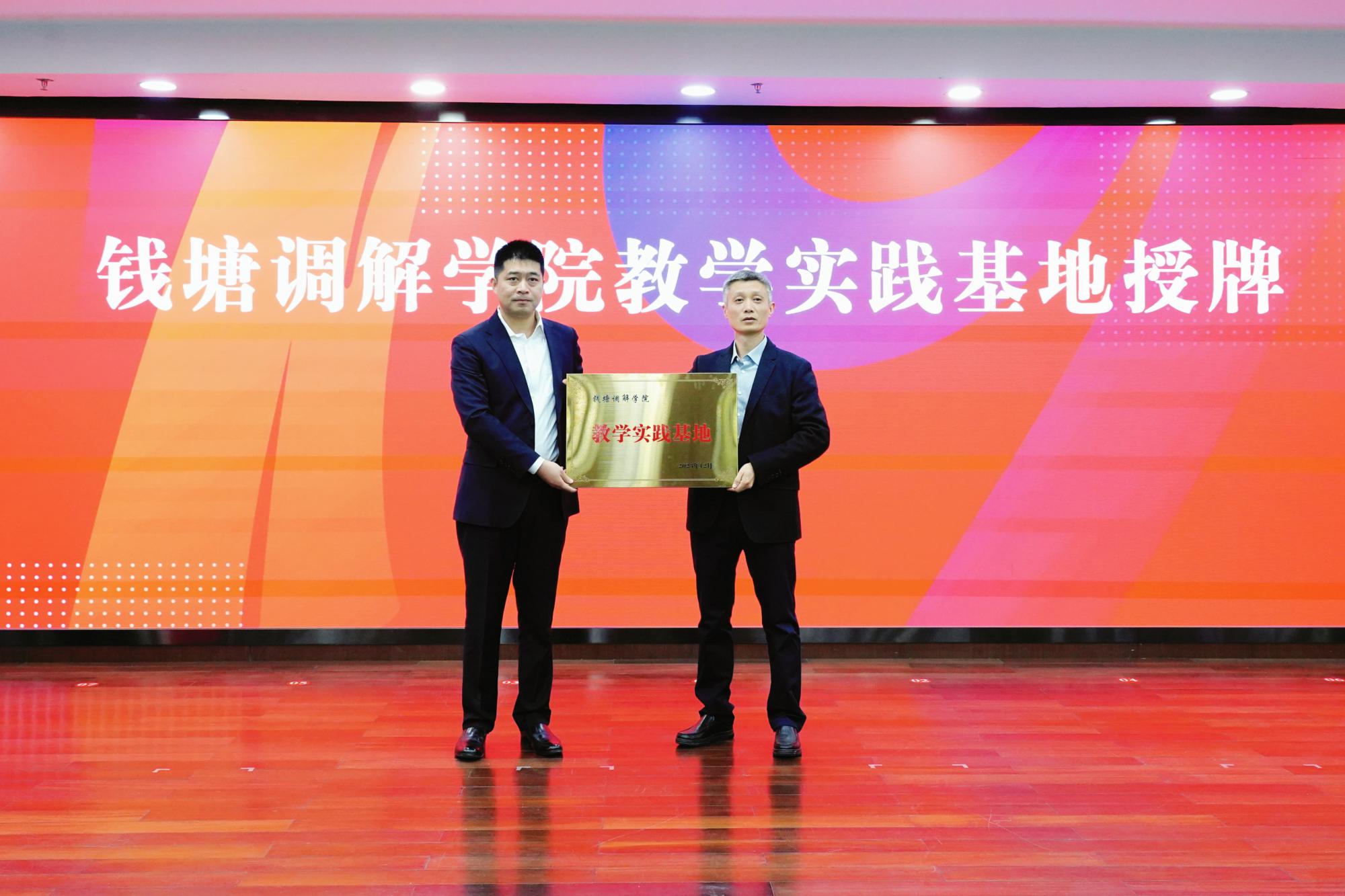 足球推荐 党委书记丁洪向钱塘区社会治理中心(综治中心)副主任诸士楷授牌钱塘调解足球推荐 教学实践基地。
