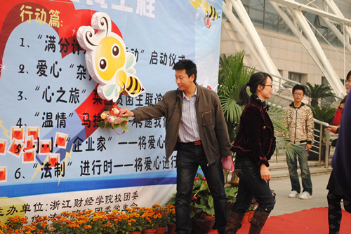 活动开始,主持人首先介绍了“一元钱工程”的重要意义和本次活动的吉祥物小蜜蜂的寓意。在热烈的掌声中,校党委副书记王宇航教授将花篮挂在了吉祥物身上,寓意辛勤的蜜蜂开始采撷爱心之蜜,此举也充分体现了校领导对本次活动的支持与关注。