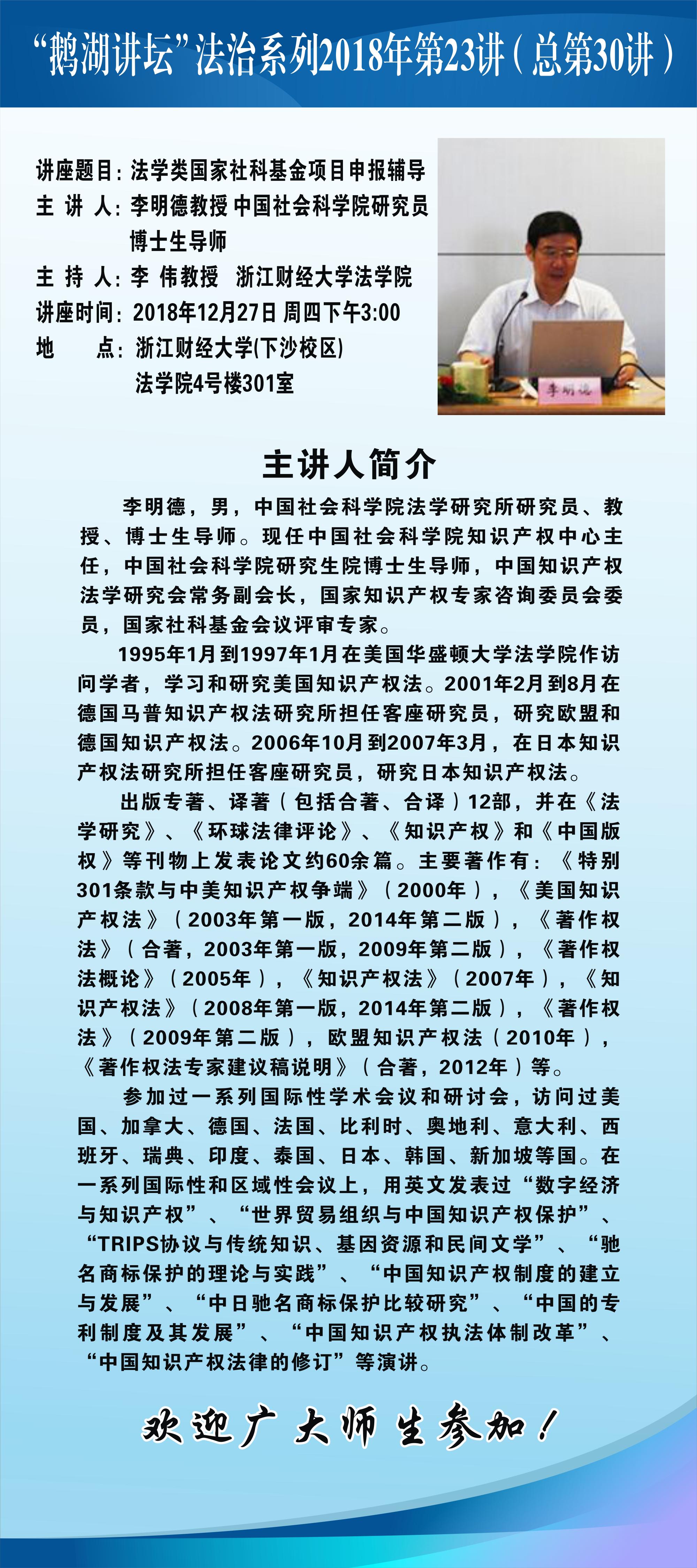 “鹅湖讲坛”法治系列2018年第23讲(总第30讲)中国社会科足球推荐 法学研究所研究员李明德教授