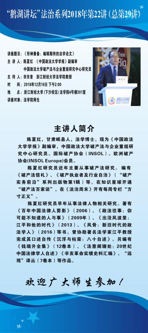 “鹅湖讲坛”法治系列2018年第22讲(总第29讲)中国政法大学破产法与企业重组中心陈夏红研究员