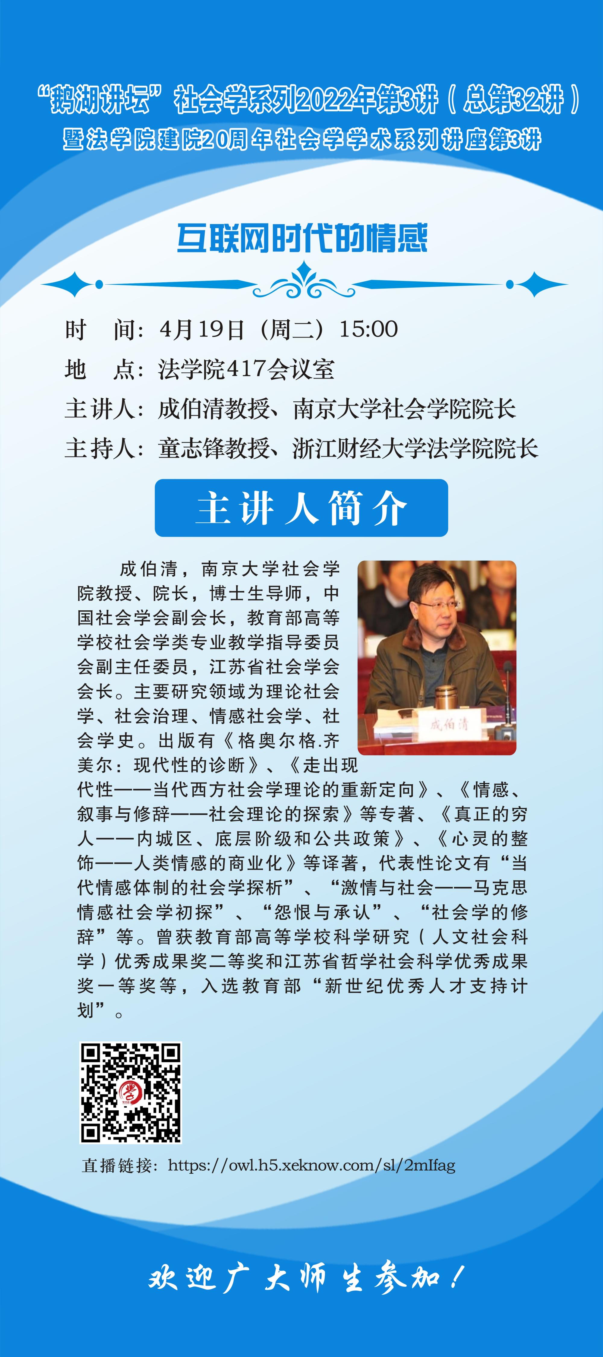 “鹅湖讲坛”社会学系列2022年第3讲暨足球推荐 建院20周年社会学学术系列讲座第3讲南京大学成伯清教授