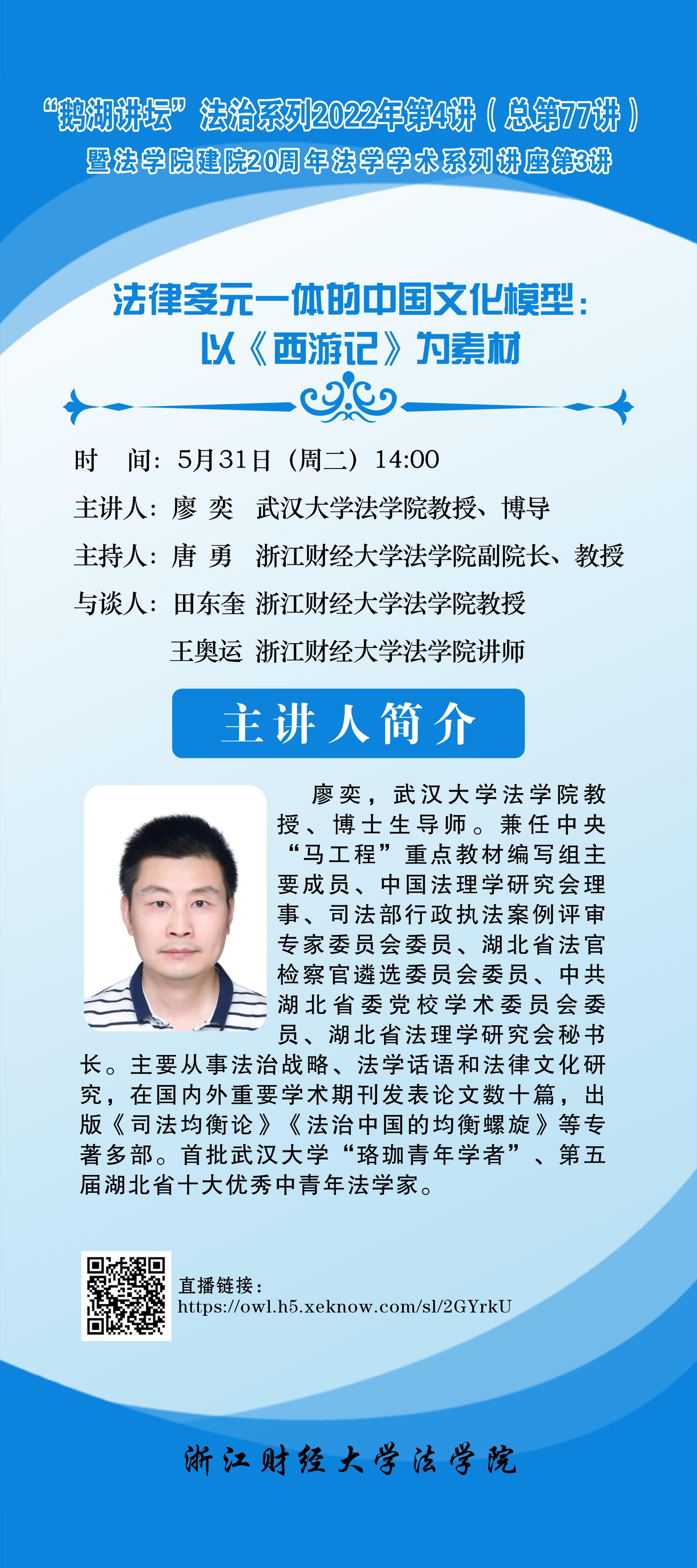 “鹅湖讲坛”法学系列2022年第4讲暨足球推荐 建院20周年法学学术系列讲座第3讲武汉大学廖奕教授