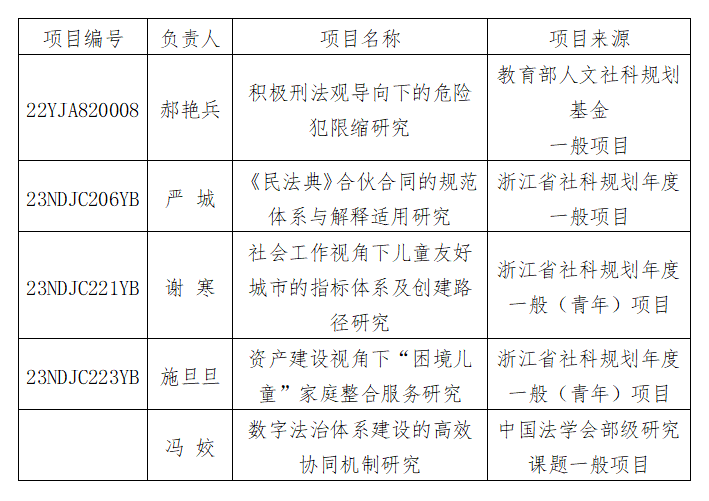 近日,足球推荐 多位教师获省部级科研项目立项。郝艳兵副教授获2022年度教育部人文社会科学研究规划基金一般项目立项。严城博士、施旦旦博士、谢寒博士获2023年度浙江省哲学社会科学规划年度一般课题立项。冯姣副教授获中国法学会2022年度部级法学研究课题立项。