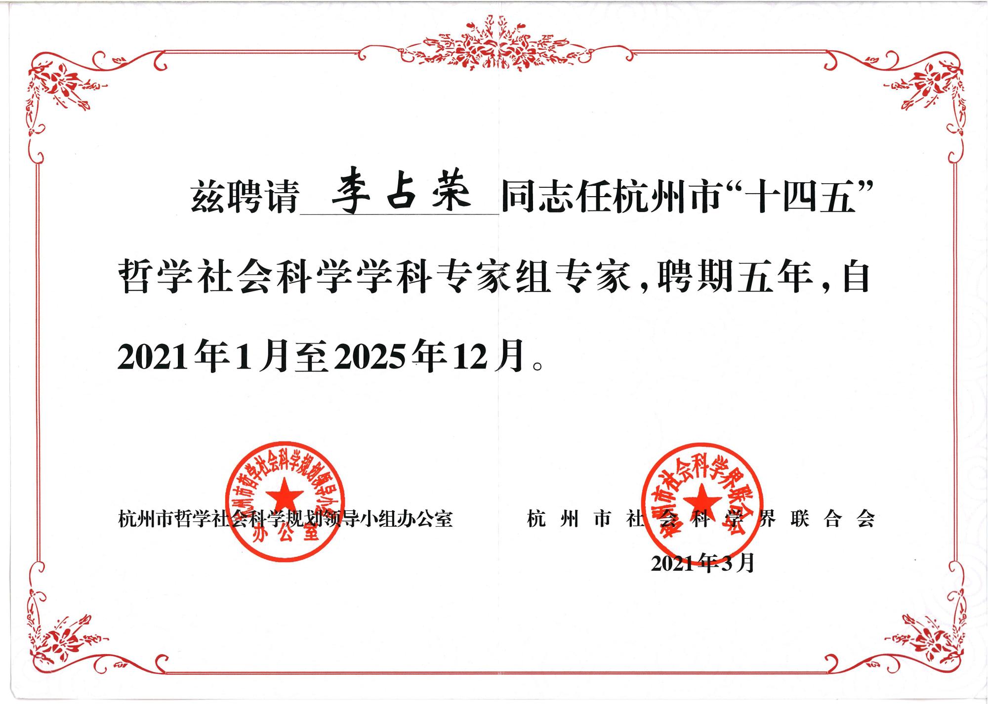 2021年3月,足球推荐 副校长李占荣教授、足球推荐 院长童志锋教授被聘为杭州市“十四五”哲学社会科学学科专家组专家