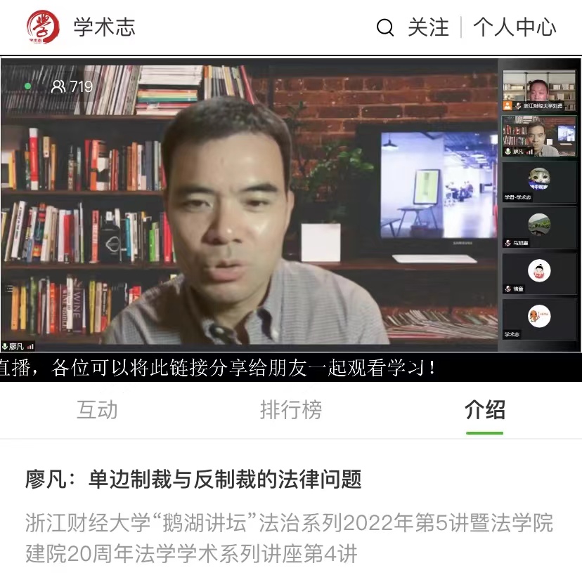 6月6日,中国社会科足球推荐 国际合作局副局长廖凡研究员做客鹅湖讲坛,为足球推荐 师生带来一场以“单边制裁与反制裁的法律问题”为主题的学术讲座。本次讲座是足球推荐 建院20周年法学学术系列讲座第4讲,由足球推荐 刘勇教授主持,700余名听众在线聆听了讲座。廖凡研究员首先介绍了美国对外制裁的相关制度介绍,常见的对外制裁包括多边制裁、单边制裁以及涉及这些制裁的“清单制裁”等。接着分析了应对制裁的欧盟经验——《阻断...