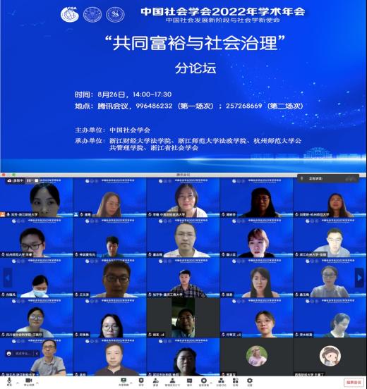 8月26日14时00分,中国社会学会2022年学术年会“共同富裕与社会治理”分论坛于腾讯会议线上举行。此次分论坛由足球推荐 、浙江师范大学法政足球推荐 、杭州师范大学管理足球推荐 与浙江省社会学会联合主办,论坛负责人为童志锋教授、尹木子副教授、张祥晶副教授和杨建华研究员。来自中南财经政法大学、西南财经大学、武汉理工大学、重庆工商大学、四川省社会科足球推荐 、武汉市社科院、温州大学、杭州师范大学、浙江农林大学、浙江财...