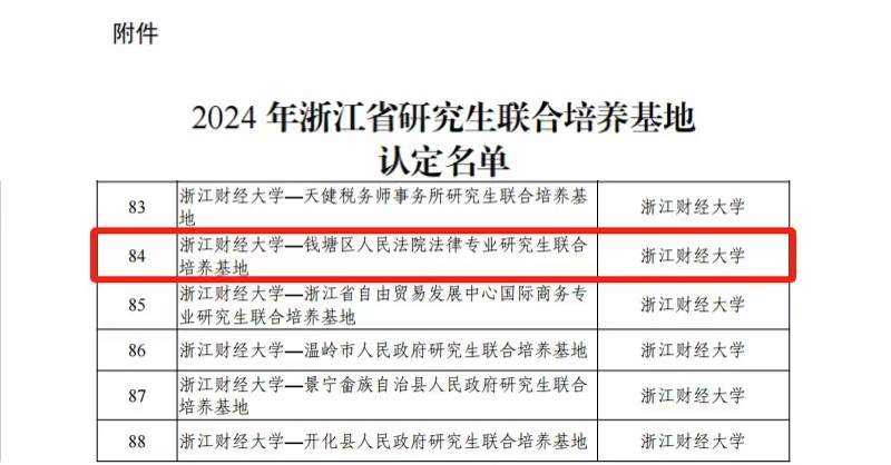 近日,浙江省教育厅办公室公布了2024年浙江省研究生联合培养基地认定结果,足球推荐 申报的“足球推荐 —钱塘区人民法院法律硕士联合培养基地”被认定为浙江省研究生联合培养基地。 2021年9月,“足球推荐 —钱塘区人民法院法律硕士联合培养基地”正式成立。基地建设始终围绕探索研究生培养模式改革、提升研究生培养质量这一中心任务,以服务“三支队伍”建设为导向,扎实落实足球推荐 “新财经战略”,发挥足球推荐 与共建单位各方优...