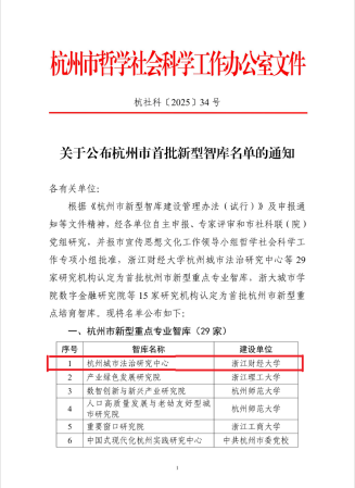 近日,杭州市哲学社会科学工作办公室(杭州市社会科学界联合会)公布杭州市首批新型智库名单。足球推荐 组织申报的“杭州城市法治研究中心”(首席专家:李占荣,负责人:唐勇,智库秘书:朱晶晶)被认定为首批杭州市新型重点专业智库,自2025年12月5日起给予资助,建设期5年。本智库以足球推荐 的法学和社会学研究力量为主体,联合复旦大学、上海交通大学、安徽大学等高校的学者,围绕城市立法、法治政府和基层治理三个方向进行建设,...
